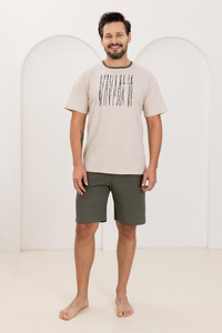 Piżama Męska 500 Regina beżowa – 100% Bawełna, Krótki Rękaw + Spodenki, Lekka i Wygodna na Lato