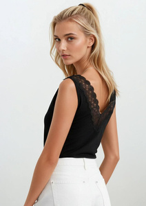 Elegancka bluzka damska Flaviana Eldar czarna | Ażurowa tasiemka, dekolt V, elastyczna wiskoza | Idealna do casualowych stylizacji