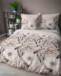 5632 A Pościel flanelowa Pastel Flowers Detexpol beżowa w białe kwiaty i liście– ciepła, miękka i elegancka