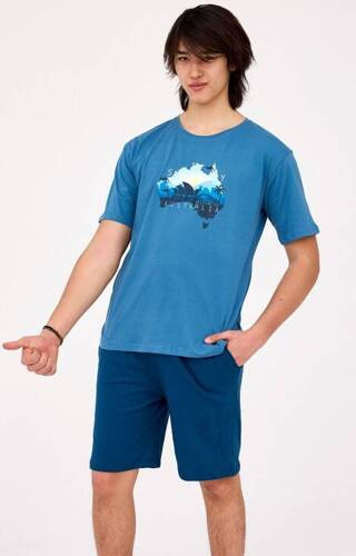 593/175 Popcorn Cornette Piżama Chłopięca – Niebieska Koszulka z Nadrukiem i Spodnie z Bawełny