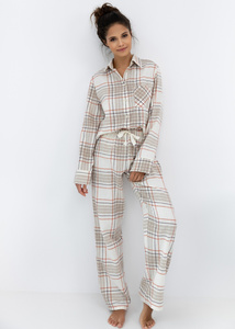3438 Vera Taro piżama damska bawełniana beżowy – długi rękaw, spodnie w kratkę z falbanką