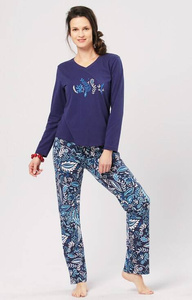 Folk Piżama Damska długi rękaw, długie spodnie Italian Fashion - granatowy/druk