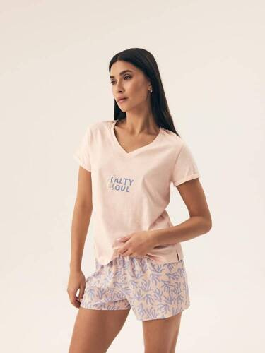 Piżama Mefemi Noelia PC82 cappuccino – bawełniana koszulka, krótkie wzorzyste spodenki, komplet damski