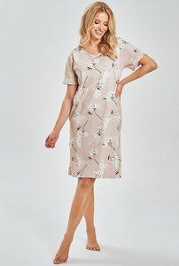 Koszula Nocna Damska Regina 171 beżowy – 100% Bawełna, Krótki Rękaw, Półokrągły Dekolt, Kieszonka, Długość do Kolan