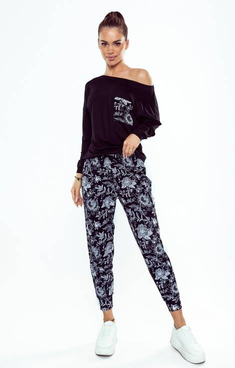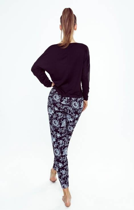 Efektowna piżama damska wykonana z miękkiej dzianiny wiskozowej. Czarna bluza, luźno osadzona na ramionach, spodnie, które przykuwają wzrok. Nogawki i rękawki zakończone ściągaczem. Na wysokości piersi ozdobna kieszonka.