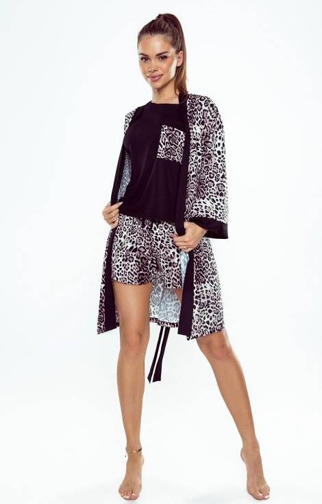 Efektowna piżama damska wykonana z miękkiej dzianiny wiskozowej. Czarna bluza, luźno osadzona na ramionach, spodnie, które przykuwają wzrok. Na wysokości piersi ozdobna kieszonka. Do kompletu polecamy szlafrok Shanti.