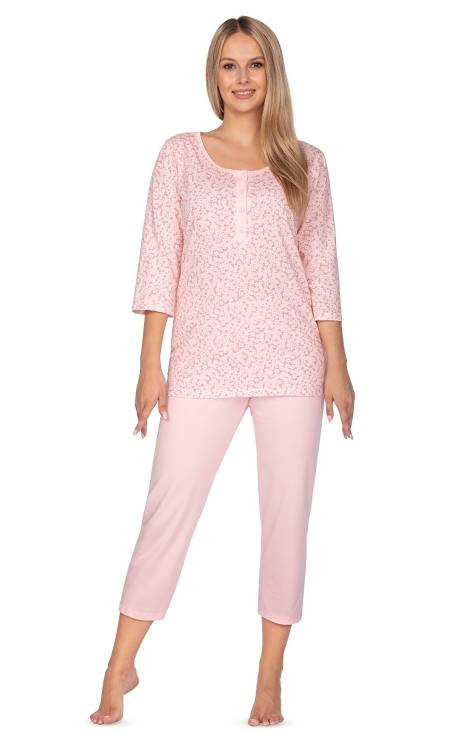 Piżama damska wykonana z wysokiej jakości bawełny. Bluza z rękawem 3/4 ozdobiona nadrukiem, zapinana na guziki.