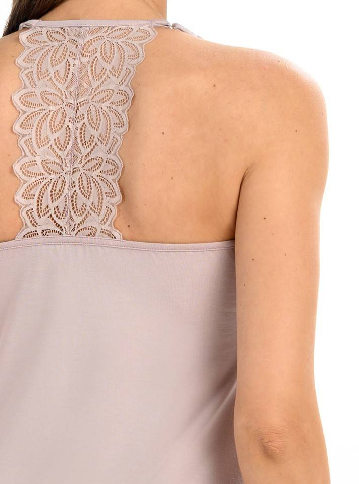Damska koszulka na cienkich ramiączkach. Wykonana jest z wysokogatunkowej wiskozy, która jest bardzo przewiewna i miła dla ciała. Wiskoza ma właściwości chłodzące, a więc doskonale sprawdza się w letnie, upalne dni. Fason koszulki jest lekko rozkloszowany w kształcie litery A. Ten fason doskonale kryje kobiece niedoskonałości i zbędne kilogramy, ponieważ z uwagi na krój nie opina ciała, nadając sylwetce kobiecych kształtów. Koszulka połączona jest na dekolcie z elegancką, elastyczną koronką, o wyrazistych motywach kwiatowych.