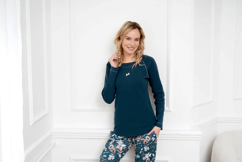Nigdy nie wiadomo, kiedy przyda się elegancka piżama! Ta z pewnością będzie chętnie noszona przez każdą kobietę. Damska piżama z długimi spodniami i długim rękawem zapewni wygodę, swobodę przyjemność dla skóry w każdą noc. Naturalny materiał jest oddychający i bezpieczny, a klasyczny krój to gwarancja komfortu. Ściągaczowa bluza damskiej bawełnianej piżamy wykończona jest okrągłym dekoltem oraz uroczą, malutką kokardką, zaś spodnie mają funkcjonale kieszenie i w całości są zdobione pięknym, kwiatowym wzorem. Damska klasyczna piżama dostępna jest w rozmiarach od S do XL, w niebiesko-biało-beżowej tonacji kolorystycznej.