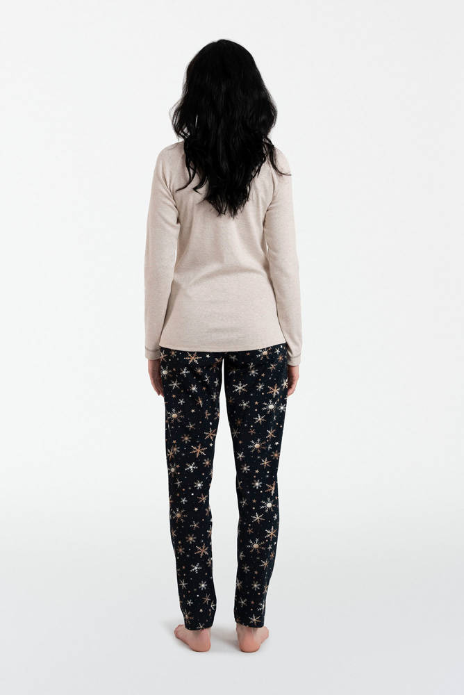 Modna damska piżama świetnie sprawdzi się zarówno na wyjazdach służbowych i wakacjach, jak i w domu. Jej prosty, klasyczny krój to gwarancja wygody i swobody, a naturalny materiał zapewni odpowiedni komfort termiczny w chłodne noce. Bawełniana damska piżama z długimi spodniami i długim rękawem wykończona jest okrągłym dekoltem, pod którym jest ozdobna, urocza kokardka i śliczny wzór śnieżynek. Taka kobieca piżamka to obietnica przyjemnie przespanej nocy. Damska piżama dostępna jest w rozmiarach od S do XL i w odcieniach czerni oraz melanżowego beżu.