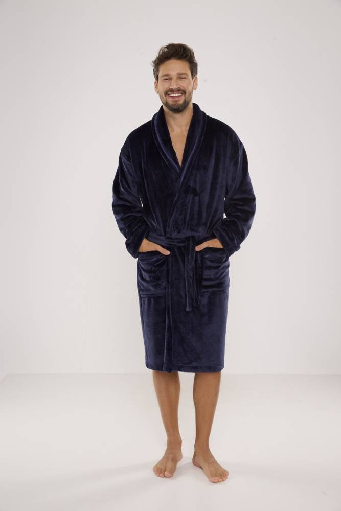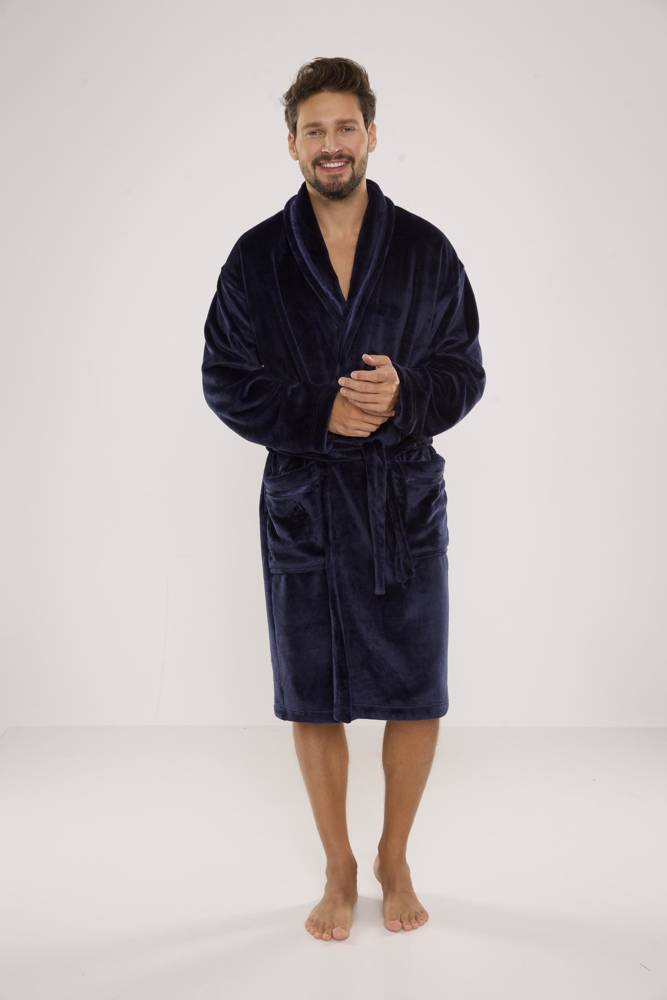 Długi szlafrok męski z miękkiej dzianiny typu soft. Wiązany w pasie, na biodrach kieszenie zewnętrzne, na wysokości klatki piersiowej naszyta kieszonka. Miły i przyjemny w dotyku, gwarantuje komfort noszenia. Główną zaletą tego modelu jest cieplutka i miła w dotyku pluszowa tkanina idealnie wchłaniająca wodę.
