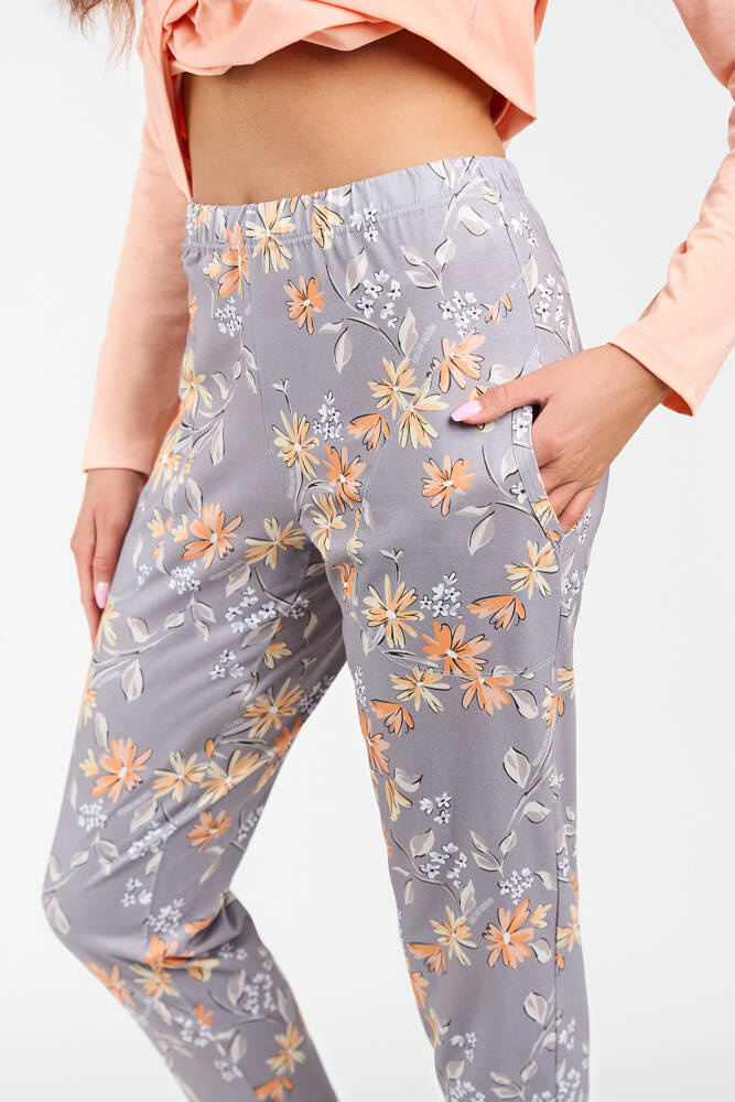 Spokojny wieczór przy kominku? Tylko w wygodnej piżamie! A takie warunki gwarantuje bawełniana damska piżama z długimi spodniami i długim rękawem, prosta, a zarazem elegancka i jakże komfortowa! Naturalny materiał zapewni skórze oddychanie i przyjemność, a prosty krój to obietnica całkowitej swobody i komfortu. Spodnie tej stylowej damskiej piżamy zdobione są pięknym, kwiatowym wzorem i posiadają funkcjonalne kieszonki, zaś gładka bluza wykończona jest okrągłym dekoltem i małą, uroczą kokardką. Elegancka piżama kobieca dostępna jest w rozmiarach od S do XXL, w łososiowo-szarej tonacji kolorystycznej.