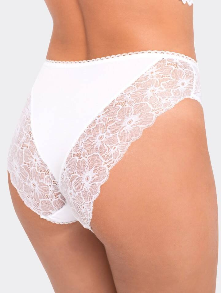 Figi damskie uszyte z bawełny najwyższej jakości. Prosty, ponadczasowy wzór ozdobiony koronką wokół nogawek.