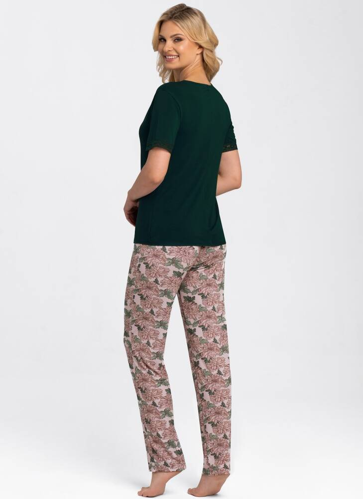 Elegancka piżama z wiskozy. Koszulka klasyczna, gładka, w kolorze butelkowej zieleni z krótkim rękawem. Dekolt w szpic, zdobiony subtelnym paskiem koronki