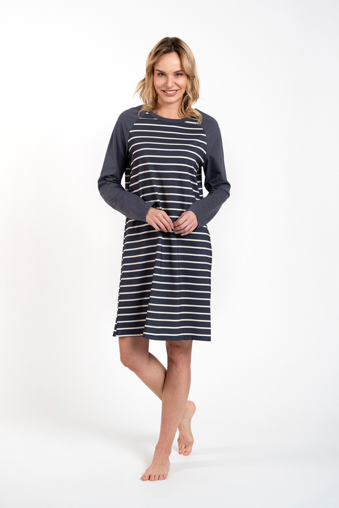 Bawełniana damska koszula nocna to gwarancja wygody i swobody, której pragnie i na którą zasługuje każda kobieta! Lekki, luźny krój koszuli do spania, a także bezpieczny oraz przyjemny dla skóry materiał zapewnią komfort zarówno w chłodne, jak i ciepłe noce. Długi rękaw i długość do kolan sprawiają, że koszula nocna idealnie sprawdzi się w domu, jak i na wyjazdach, a ponadczasowy wzór pasów pasuje do każdej kobiety. Koszula nocna ze 100% bawełny dostępna jest w dwóch wersjach kolorystycznych – grafitowym i cappuccino oraz w rozmiarach od S do XXL.