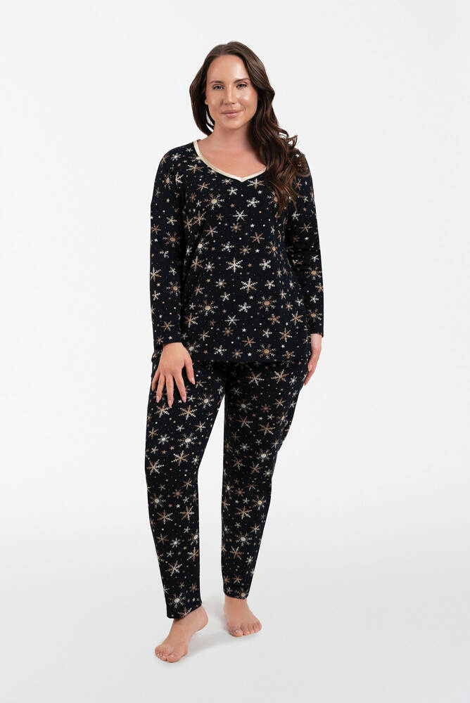 Idealna piżama na zimne noce? Nie tylko ciepła, ale i… w śnieżynki! Ta urocza damska piżama zdobiona pięknym wzorem śnieżynek z pewnością zachwyci każdą kobietę. Bawełniana piżamka ma prosty krój, który nie będzie krępował ruchów i zagwarantuje komfort. Bluza damskiej piżamy z długim rękawem i długimi spodniami posiada dekolt w serek wykończony ozdobnym atłasem. Śliczne śnieżynki znajdują się na całej piżamce. Ta modna, damska piżama dostępna jest w rozmiarach od S do XXL, w kolorze czarnym z odcieniami beżu.