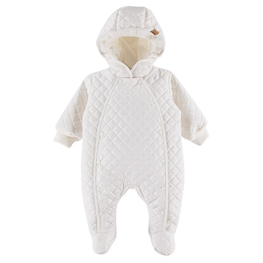 Doskonale ochroni dziecko przed chłodem, deszczem oraz wiatrem. Posiada dodatkową warstwę ocieplacza. Wewnątrz wyłożony jest bawełną. W kapturze kombinezonu została wszyta gumka, która zapobiega odstawaniu kapturka i chroni główkę dziecka przed zimnem. Kombinezon zapinany jest na napy.
