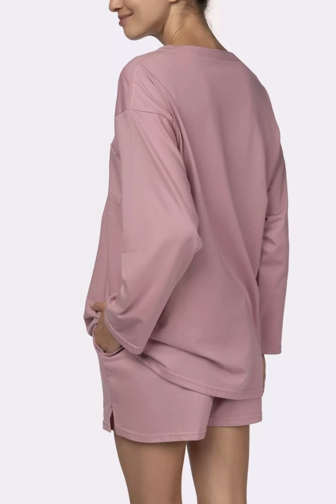 Urocza piżama damska uszyta z miękkiej i przyjemnej dla ciała bawełny. Model z oversizową, wygodną koszulką oraz krótkimi spodenkami podkreślającymi nogi. Spodenki mają nieco wyższy stan oraz szeroką gumę w pasie. Wykonana z niezwykle delikatnej i przewiewnej bawełny, zapewniającej komfort podczas snu.