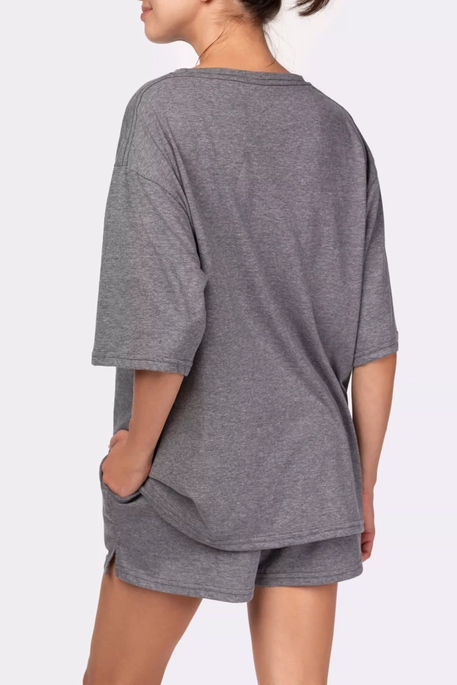 Urocza piżama damska uszyta z miękkiej i przyjemnej dla ciała bawełny. Model z oversizową, wygodną koszulką oraz krótkimi spodenkami podkreślającymi nogi. Spodenki mają nieco wyższy stan oraz szeroką gumę w pasie. Wykonana z niezwykle delikatnej i przewiewnej bawełny, zapewniającej komfort podczas snu.