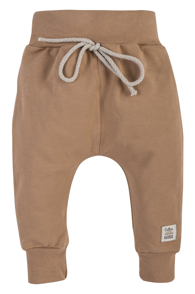 Modne spodnie dresowe z brązowej dresówki. Wszyty w pasie nieuciskający ściągacz z gumką, utrzymuje ubranko w odpowiednim miejscu. Swobodny fason spodni zapewni dziecku wygodę w trakcie nauki chodzenia, raczkowania czy zabawy.
