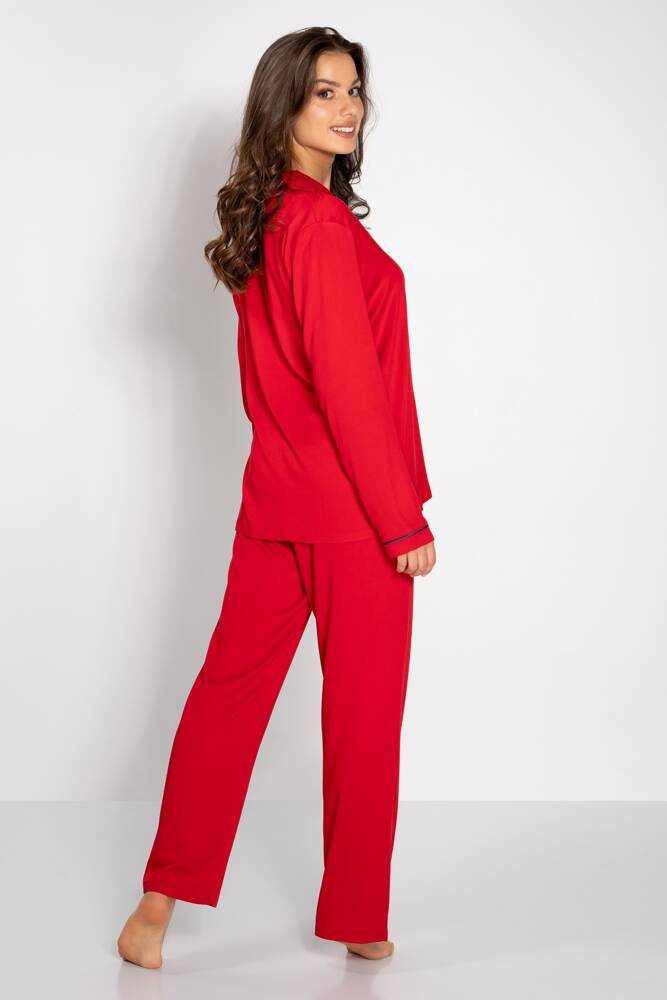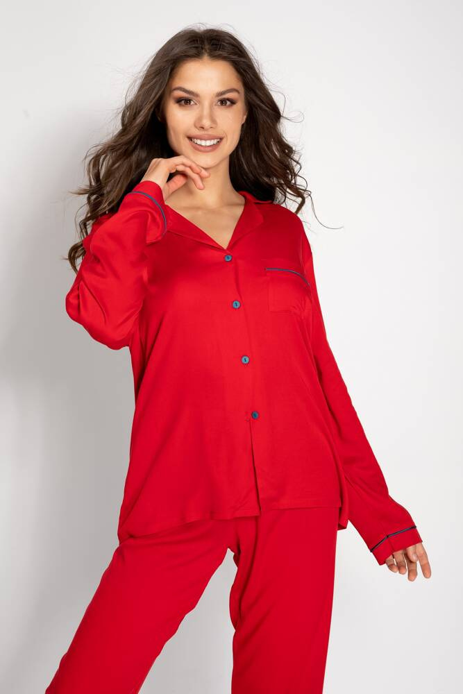 Piżama damska wykonana z przyjemnej w dotyku, miękkiej tkaniny. Tkanina jest odpowiedniej gramatury dzięki temu wspaniale się układa, mniej gniecie a krój bez problemów zachowuje swój kształt. Zapinana na guziki, wykończona kołnierzem. Idealnie sprawdzi się do karmienia.