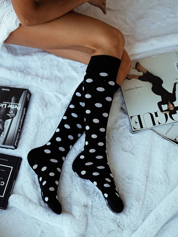 Podkolanówki damskie wykonane z wysokiej jakości bawełny ozdobione wzorem w grochy.
