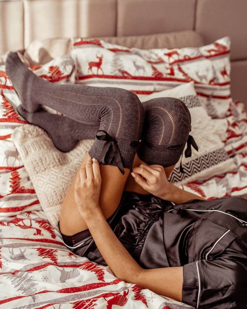 Zakolanówki damskie, z wzorzystej bawełny. Ozdobione, przeplataną satynową kokardką. Płaskie szwy, nieuciskający ściągacz zapewniają wygodę i komfort noszenia.