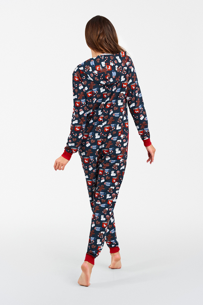 Takie wdzianko to prawdziwy hit ostatnich lat! Damska piżama-kombinezon do spania to idealne rozwiązanie na zimne noce. Idealnie nadaje się na relaks z kubkiem kakao przed TV. Damski kombinezon z bawełny zapewni skórze przyjemność i odpowiedni komfort termiczny, a jego krój to gwarancja swobody. Kombinezon nocny z suwakiem i kapturem, ze ściągaczami w rękawach i nogawkach to idealna alternatywa dla klasycznej piżamy – będzie nie tylko bardzo wygodny, ale również wygląda ciekawie. Zdobiony jest uroczym wzorem w ciasteczka, doskonałym na leniwy wieczór w domu. Damski bawełniany kombinezon dostępny jest w rozmiarach S do XL, w granatowo-czerwonej tonacji kolorystycznej.
