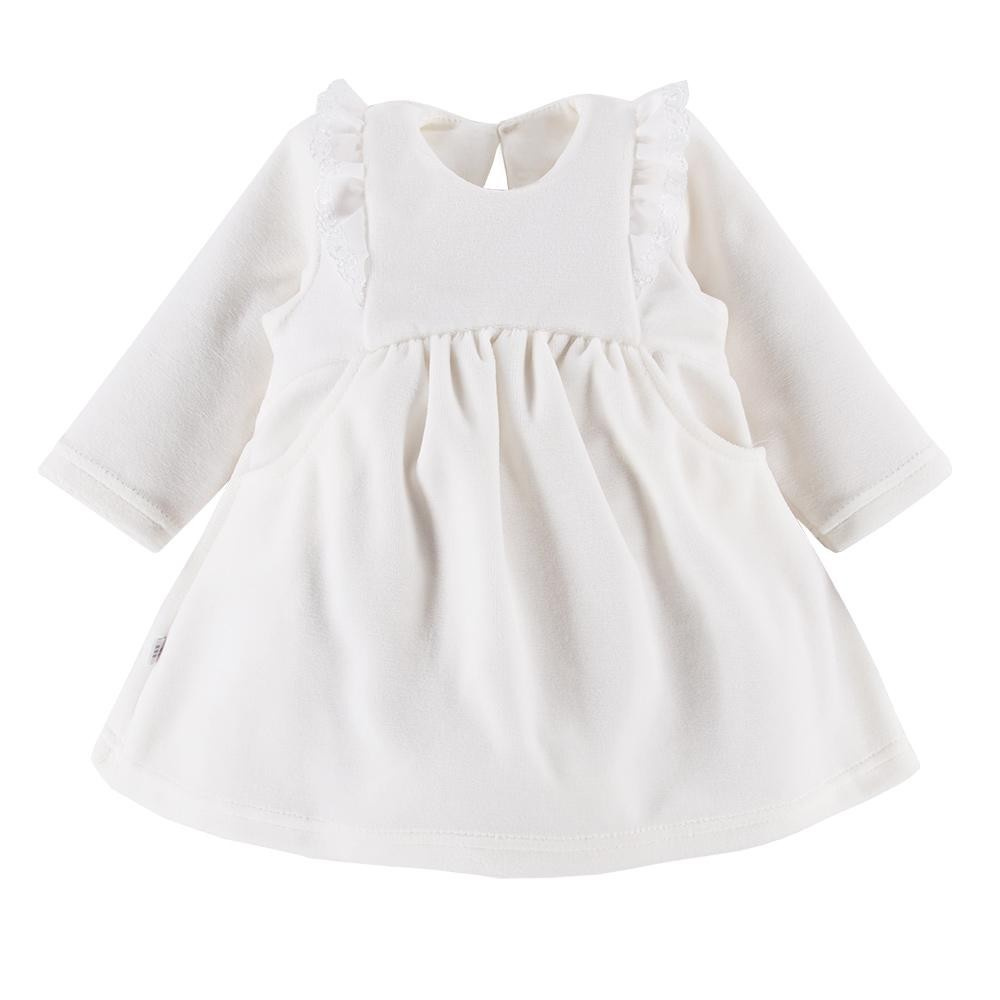 Sukienka dziewczęca z kolekcji "Ceremony" uszyta z miękkiego i przyjemnego w dotyku weluru. Posiada ozdobne falbanki wykonane z białej tkaniny. Rozpinana na karku na guziczek. Krój sukienki jest rozkloszowany.