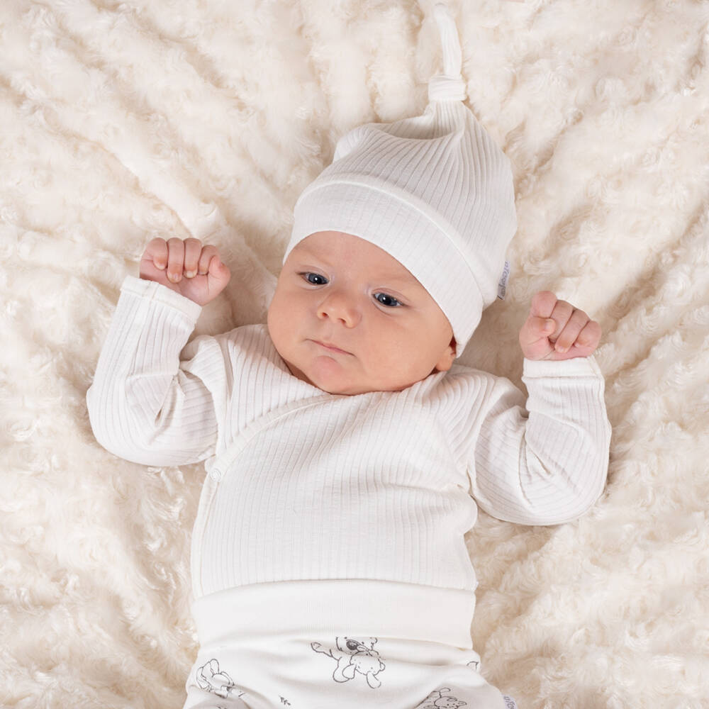 Czapeczka w kolorze kremowym, uszyta z wysokogatunkowej prążkowanej bawełny z niewielką ilością elastanu. Materiał posiada certyfikat Oeko-Tex Standard 100 Tekstylia godne zaufania. Produkt wiązany w górze na supełek, którym również można regulować sobie wysokość czapeczki. Czapka będzie świetnym uzupełnieniem stylizacji z kolekcji Olaf i nie tylko.