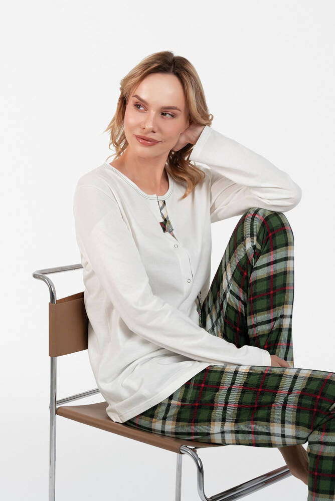 Czy piżama może być elegancka? I to jeszcze jak! Ta wyjątkowa damska rozpinana piżama ze spodniami w kratę przypadnie do gustu każdej pani ceniącej sobie dobry styl nawet w zaciszu sypialni. Bawełniana piżama damska ma miękki, przyjemny materiał, a modny wzór dodaje jej charakteru. Bluza piżamy jest gustownie wykończona kratką, ma okrągły dekolt i w całości jest zapinana na napy, zaś prosty krój spodni zapewni komfort i wygodę. W spodniach praktyczne kieszenie. Stylowa damska piżama dostępna jest w rozmiarach od S do XXL, w dwóch wariantach kolorystycznych – z ecru lub odcieniami zieleni.