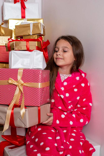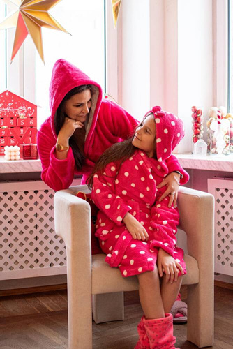 Szlafrok dziecięcy firmy FOREX o prostym kroju z kapturem. Długość do kolana, po bokach kieszenie, w pasie wiązany na pasek. Całość w groszki. Szlafrok świetnie dopasowuje się do kształtu ciała, jest niezwykle miękki i lekki, wykonany z dzianiny typu soft. Otulenie się nim po kąpieli to sama przyjemność!