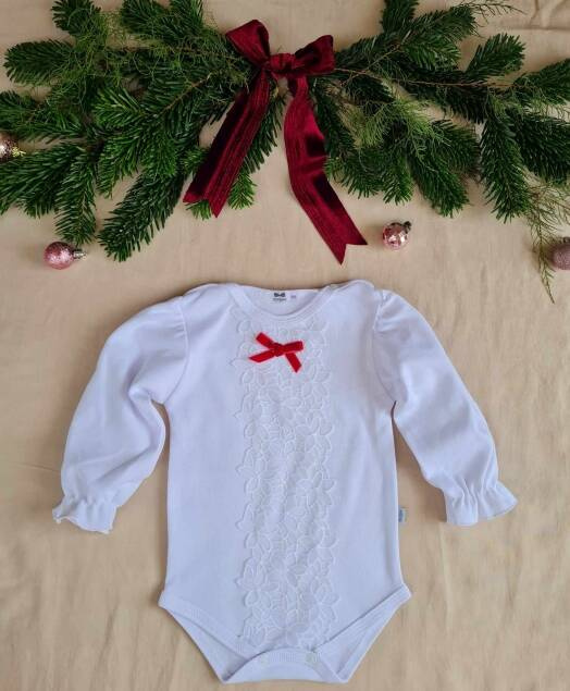 Zapytaj o produktBiałe body dla dziewczynki, z kolekcji La Bonita, zdobione po środku piękną koronką. Ubranko jest w kolorze czystej bieli. Przy kołnierzu doszyta jest czerwona kokardka, a rękawki zakończone są elastycznymi gumeczkami, które tworzą bufki. Bodziak rozpinany jest na ramionku i w kroczku na bezniklowe, antyalergiczne napki. Body zostało uszyte z miękkiej i przyjemnej dzianiny - 100 % bawełna. Body są eleganckie a zarazem wygodne dzięki czemu sprawdzą się na specjalne okazje jak i na co dzień. Polecamy w zestawie z spódniczką lub spodniami z naszych kolekcji.