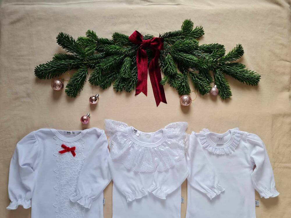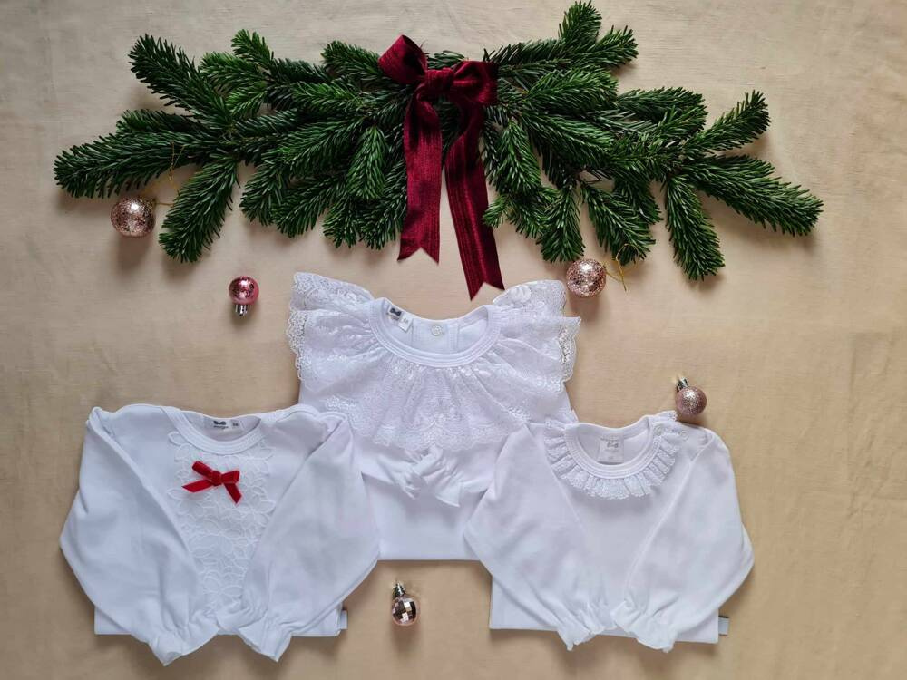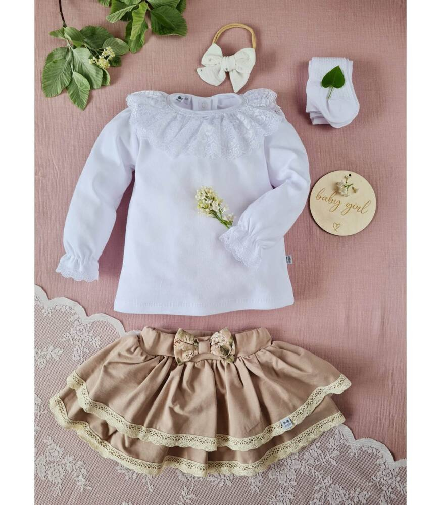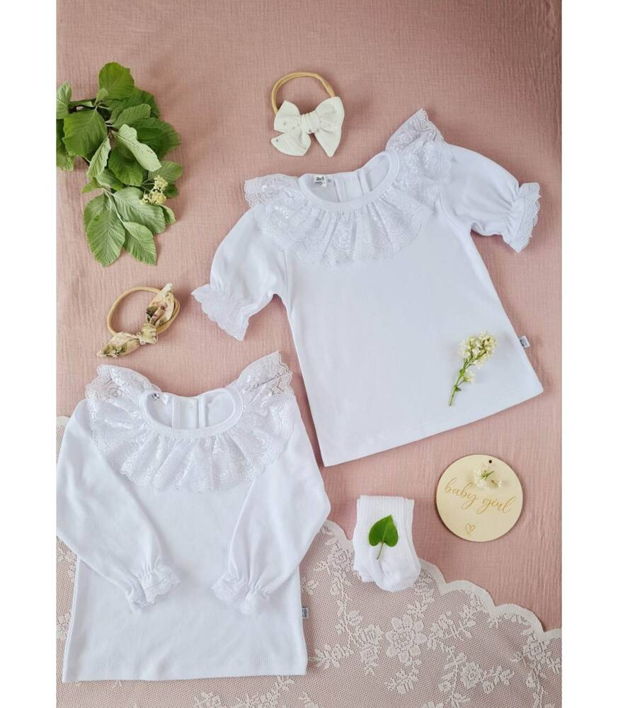 Delikatna i bardzo efektowna bluzeczka dla dziewczynki. Bluzeczka jest biała, całość zdobi piękna koronka w postaci kołnierzyka oraz bufiaste, długie rękawki, które są wykończone również koronką. Bluzka jest uszyta z przewiewnej i mięciutkiej dzianiny 100 % bawełna. Biała bluzka pasuje do każdej dziewczęcej stylizacji i nadaje jej odświętnego wyglądu.