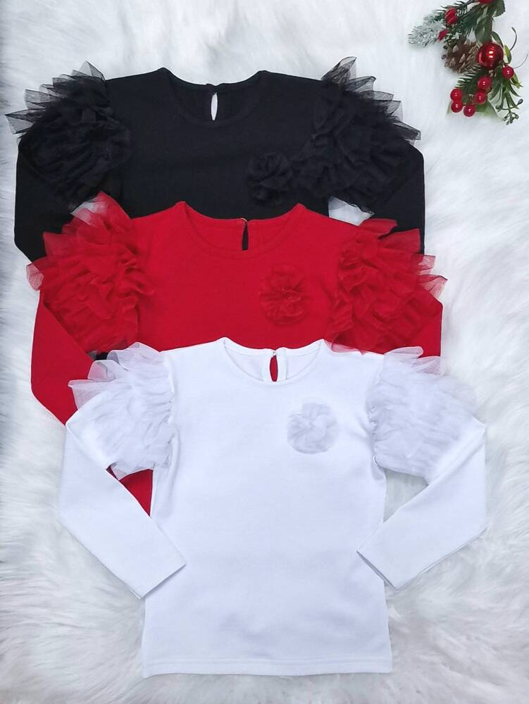 Koszulka dziecięca uszyta z miękkiej i przyjemnej w dotyku bawełny. Ozdobiona tiulowymi rękawkami. Modny krój, elegancja i niepowtarzalność! Stylizację uzupełnia spódniczka Inez.