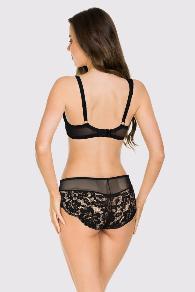 Biustonosz miękki. Miseczki z siatki pokrytej bogatą koronką, góra z beżowego tiulu zakończonego lamówką. Dekolt zdobią odpinane paseczki, brak bocznych fiszbin. Obwód ze stabilnej siatki zapewni maksymalne podtrzymanie biustu. Konstrukcja jednocześnie stabilna i lekka skierowana dla pań ze średnim, dużym i bardzo dużym biustem.