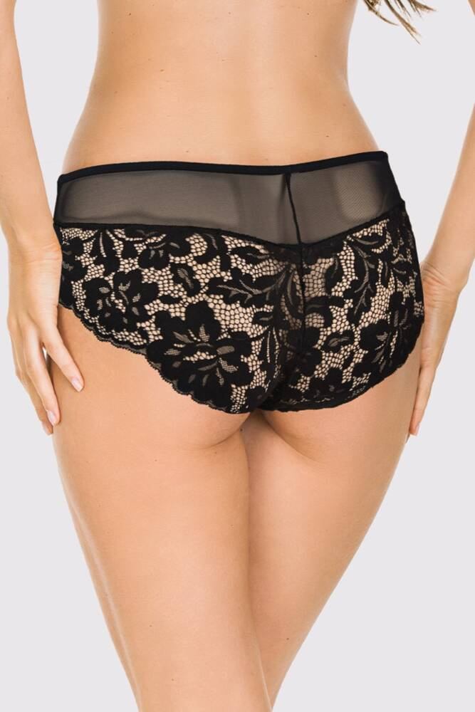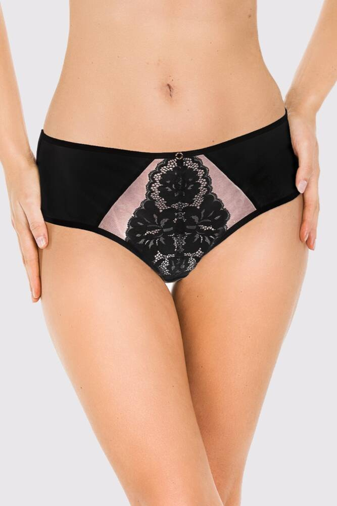 Figi klasyczne w czarnym kolorze. Przód z gładkiej satyny na bokach, środek i tył z bogatej koronki, bawełniany klin.