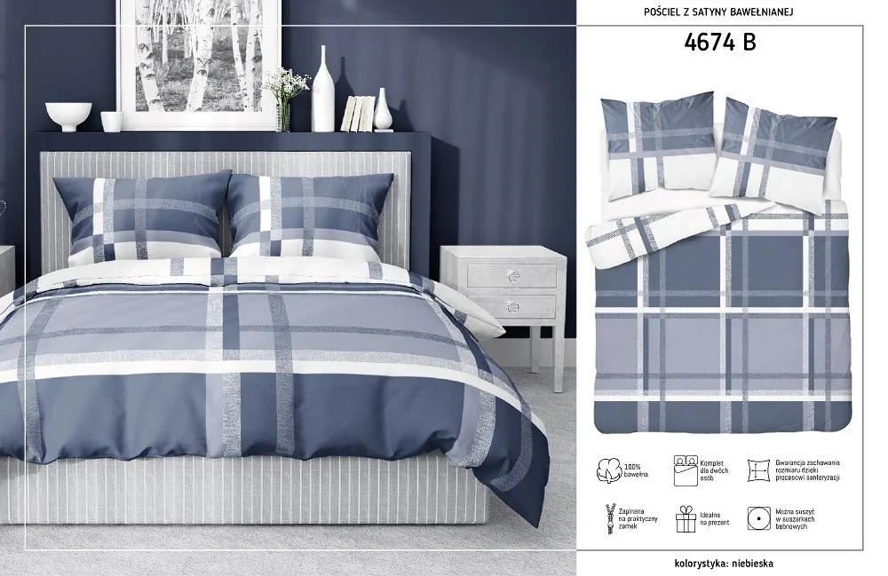 4674 B Home Satin Pościel satynowa krata Detexpol niebieski