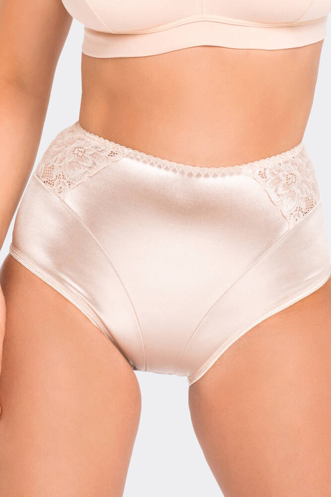 Figi z wyższym stanem, modelujące brzuch i biodra. Wykonane z połyskującej tkaniny poliamidowej, po bokach efektowne koronkowe wstawki.