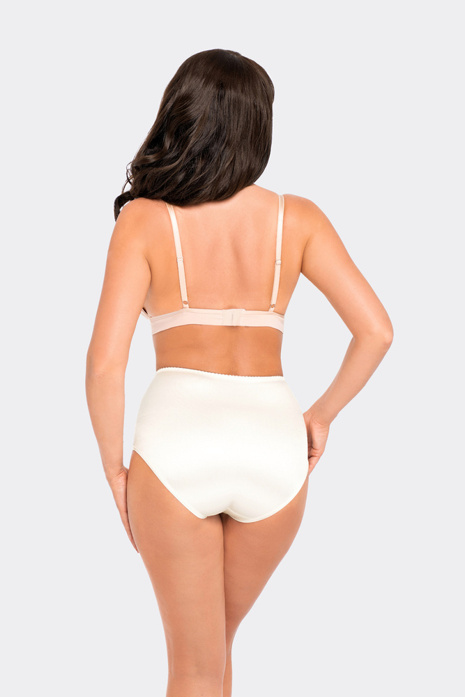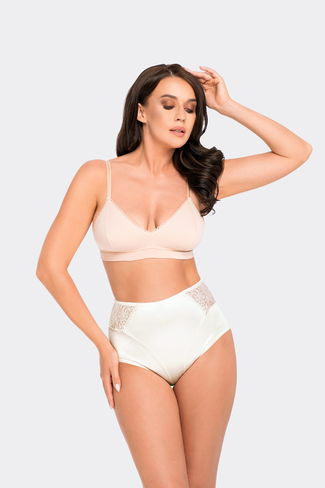 Figi z wyższym stanem, modelujące brzuch i biodra. Wykonane z połyskującej tkaniny poliamidowej, po bokach efektowne koronkowe wstawki.