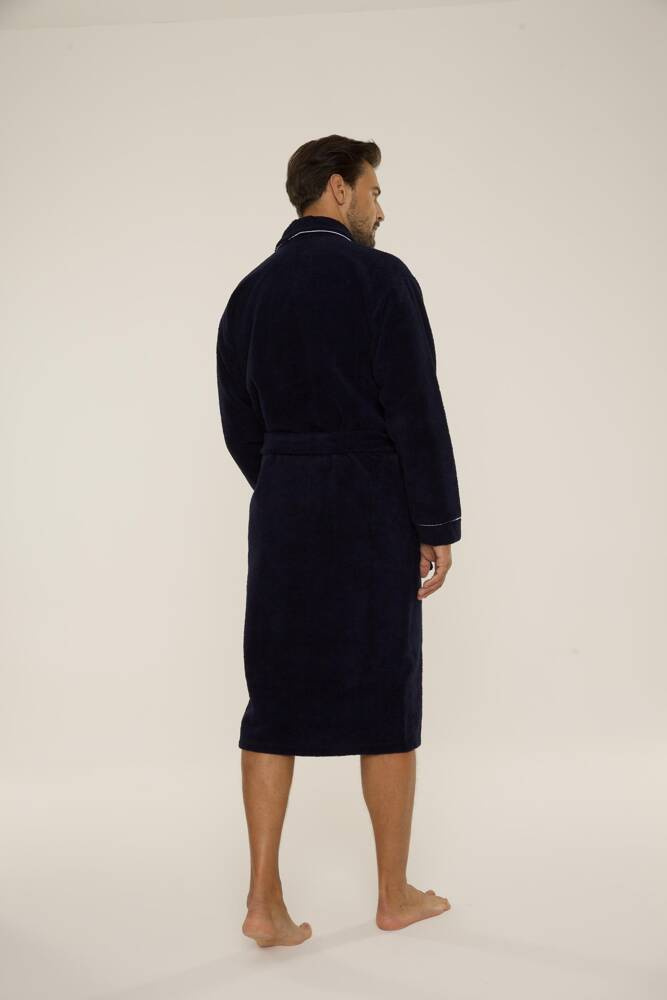Długi welurowy szlafrok męski. Model z szalowym kołnierzem, wiązany w pasie, z dwoma naszytymi kieszeniami po bokach i jedną na wysokości klatki piersiowej. Wykonany z 50% miękkiej bawełny typu frotte. Materiał przyjemny w dotyku, idealnie wchłaniającej wodę.