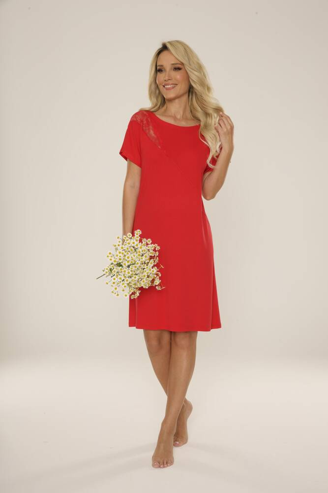 Koszula damska, z wysokiej jakości wiskozy, z krótkim rękawem. Model z krótkim rękawem, ozdobiony koronką. Dekolt okrągły. Długość do kolan. Każda kobieta poczuje się w niej wyjątkowo !!