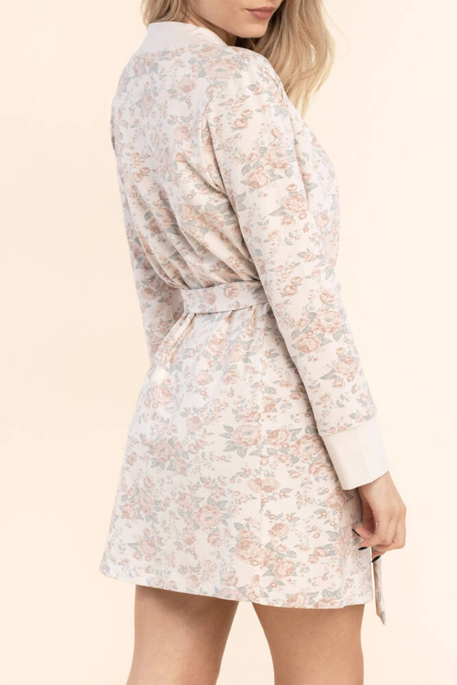 Stylowy, jak i wygodny szlafrok damski. wykonany z delikatnej dzianiny z nadrukiem w romantyczne kwiaty. Wykończony beżowymi plisami. Pasek w talii.