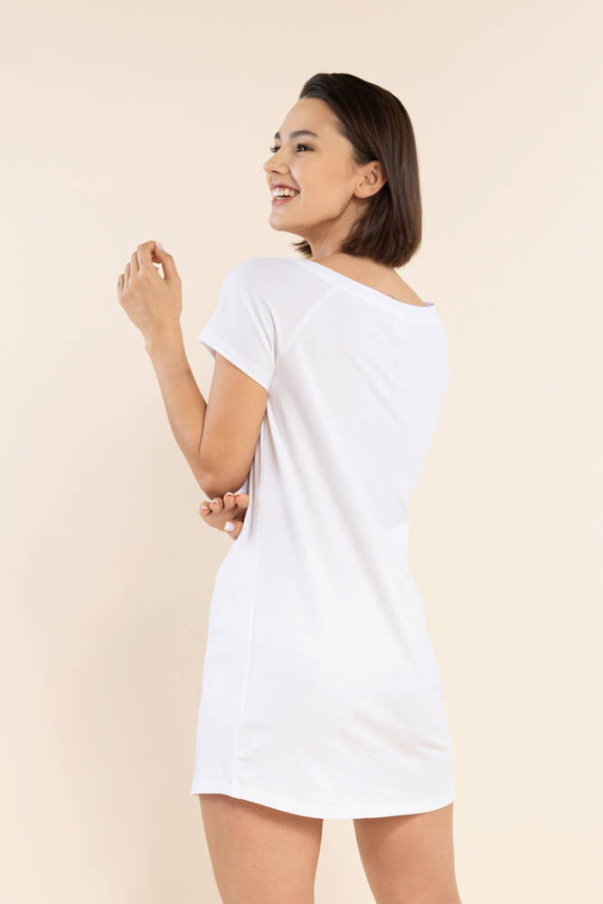 Koszula nocna idealna dla ceniących sobie komfort, prostotę i minimalizm. Standardowy fason lekko rozszerzający się u dołu. Dekolt typu łódka.