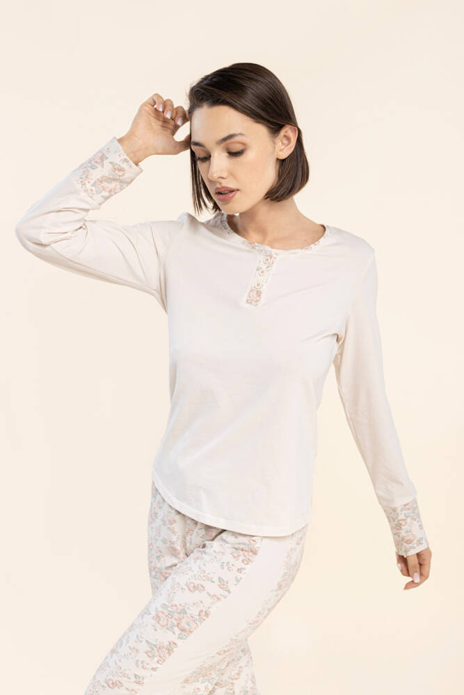 Piżama wykonana z miękkiej bawełny, zapewniająca komfort noszenia. Model o swobodnym kroju. Posiada długi rękaw wykończony mankietem w kwiatowy print. Okrągły dekolt zapinany na 3 guziki z ozdobną plisą. Gładki, lekko zaokrąglony dół. W komplecie z długimi spodniami w kwiaty. Na boku beżowy lampas. W pasie delikatna guma.