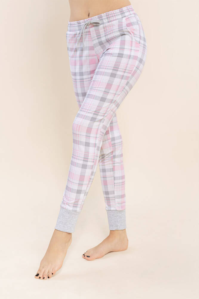 Piżama wykonana z miękkiej bawełny, zapewniająca komfort noszenia. Koszulka z długim rękawem. Posiada rozcięcia po bokach. Długie rękawy zakończone mankietami w kratkę. Dekolt typu łódka. W komplecie z długimi spodniami w różową kratę. Posiadają kieszenie. Gumka i sznurek w pasie. Zwężane nogawki wykończone ściągaczem.
