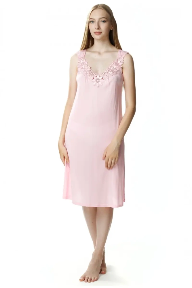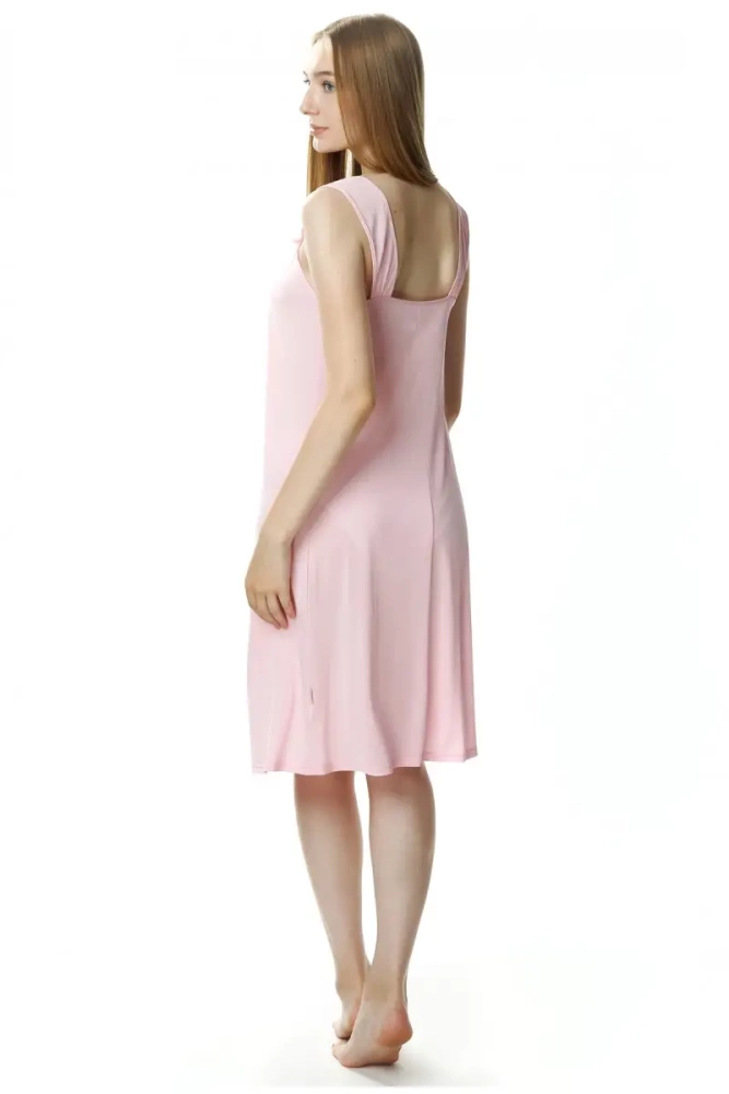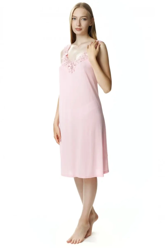 Miękka, miła w dotyku wiskoza i delikatna koronka sprawiają, że prezentowana koszula jest niezastąpionym elementem kobiecej, nocnej garderoby. Model na szerokich ramiączkach wykonanych z delikatnej koronki gipiurowej okalającej również dekolt.