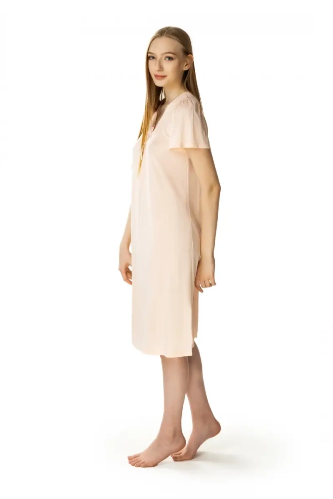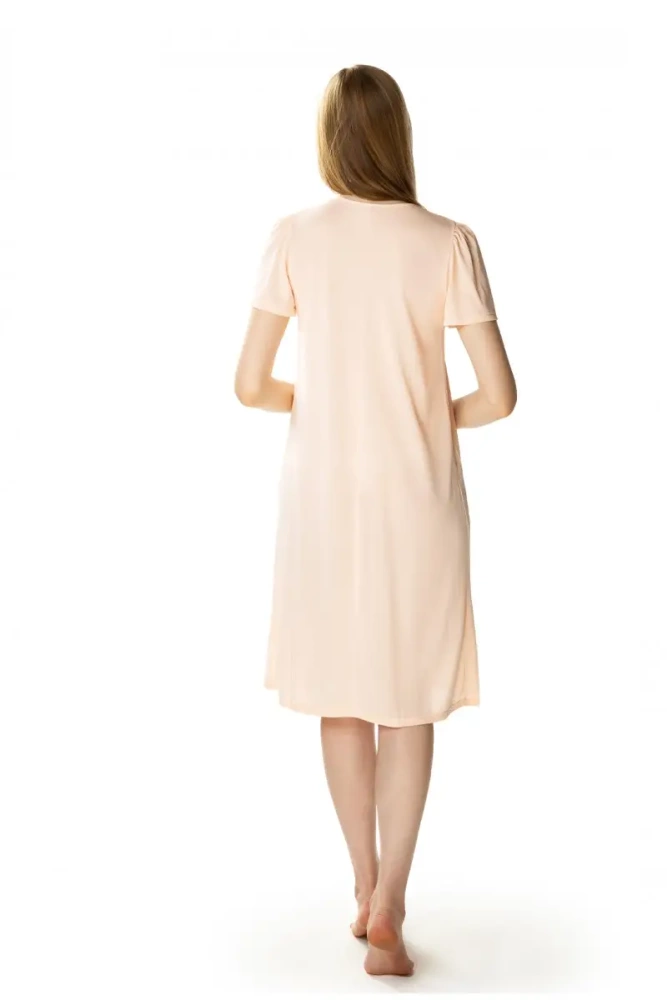 Niezwykła w swej prostocie koszula nocna z krótkim, szerokim rękawem wykonana ze zdrowej dzianiny wiskozowej. Model o luźnym kroju z dekoltem w kształcie litery “V”z niewielkim marszczeniem podkreślającym kobiece atuty. Zakończona zalotną atłasową kokardką. Długość koszuli za kolana – co zadowoli wymagające panie.
