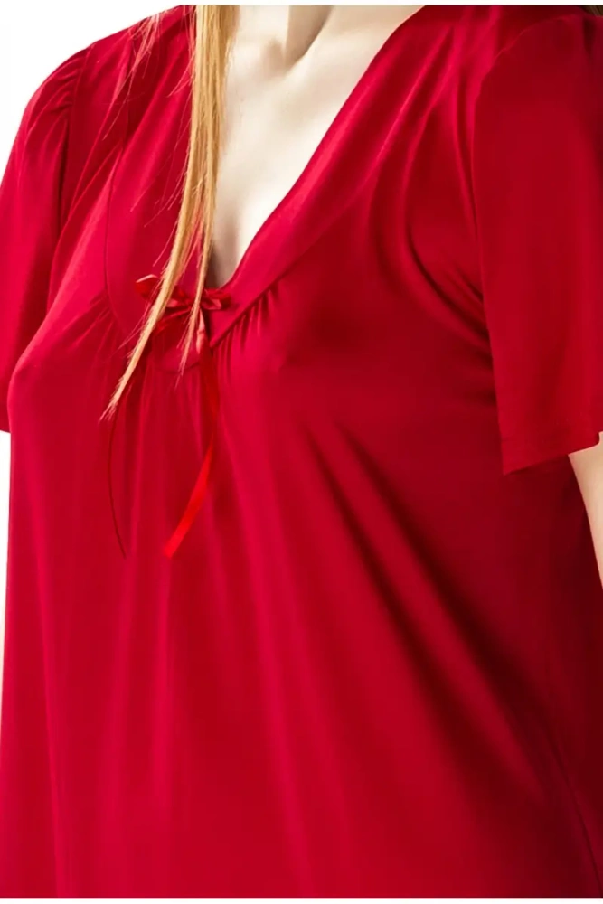 Niezwykła w swej prostocie koszula nocna z krótkim, szerokim rękawem wykonana ze zdrowej dzianiny wiskozowej. Model o luźnym kroju z dekoltem w kształcie litery “V”z niewielkim marszczeniem podkreślającym kobiece atuty. Zakończona zalotną atłasową kokardką. Długość koszuli za kolana – co zadowoli wymagające panie.