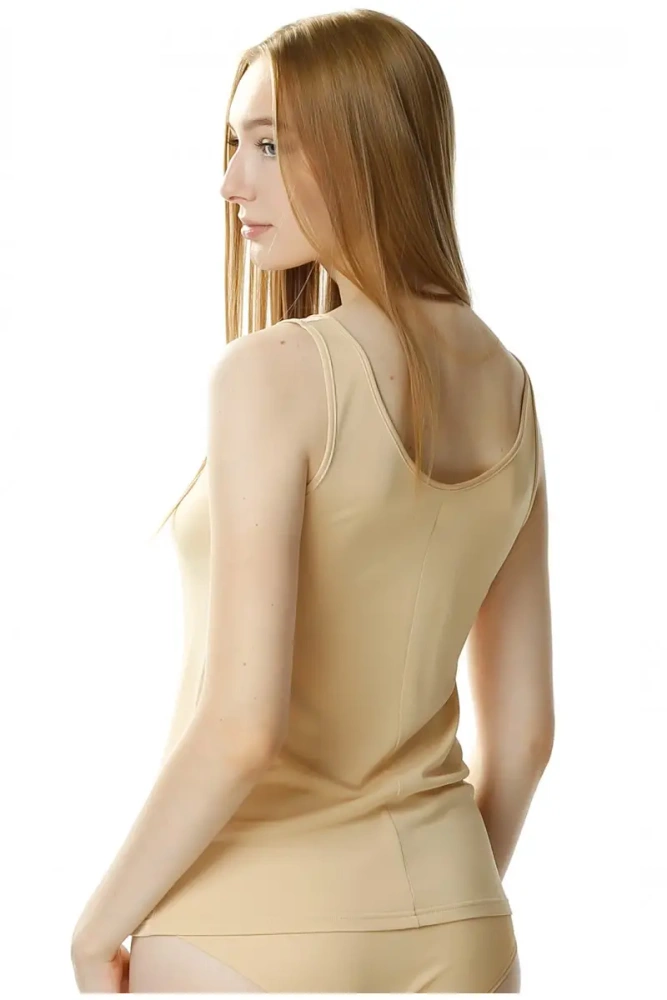Koszulka damska wykonana z dzianiny wiskozowej o zdrowotnych właściwościach, na cieniutkim ramiączku, ozdobiona gipiurową aplikacją. Przeznaczona dla kobiet lubiących, wygodę i elegancją.
